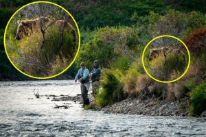 美国两男子在钓鱼,身后有只熊盯着却不知,摄影师拍照后再警告